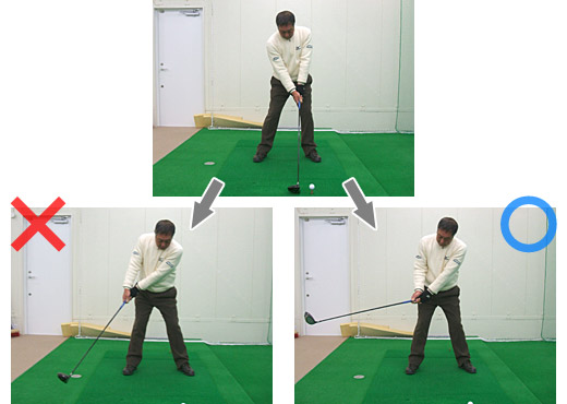 あわててクラブを振ろうとするからネ。すると、思ったようにヘッドが振れず、体ばかり速く動いてしまう。で、リズムが崩れ、インパクトで体の動きとヘッドの動きが合わなくなるのです。