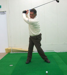 プロ 団塊の世代になると体が硬くなり、知らず知らず肩の回転が不足します。 だから、トップで左肩がきちんとアゴの下にきているか、チェックすることです。