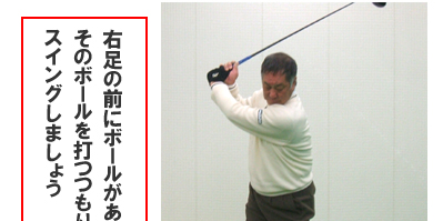 これはボクの特許ではないですが、右足の前にボールがあるとイメージし、そのボールを打つ感覚でスイングします。