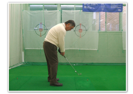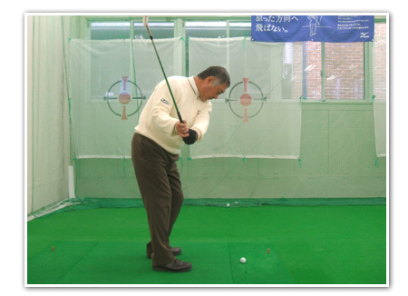 ―― (インタビュアー)フェース(ヘッド)を目標方向に振っていかず、体の回転に沿って左に振っていくことの大切さがよくわかりました。ところで、ボールの位置は?