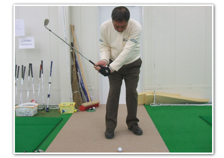 いや、ボールを高く上げるのが難しいのです。そこで、少し上げて転がすショットを教えます。 ボールを右寄りに置き、グリップを、より目標方向に出すハンドファーストで構えます。