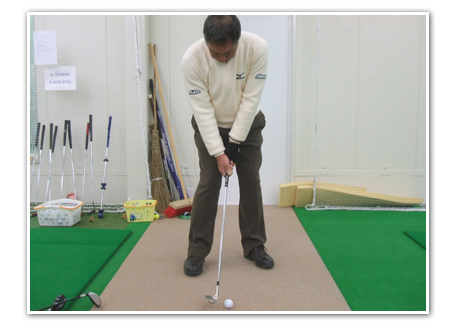ベアグラウンドでボールをきっちりとらえる時や転がしていく時は、ボールを右サイドに置いてハンドファーストで構えましたネ。