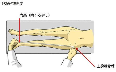 真の脚の長さを知るには、下肢長を測ってみましょう。 下肢長は、上前長骨棘(じょうぜんちょうこつきょく:骨盤の出ているところ)~内果(ないか:足関節の内くるぶし)までの長さを測ります。